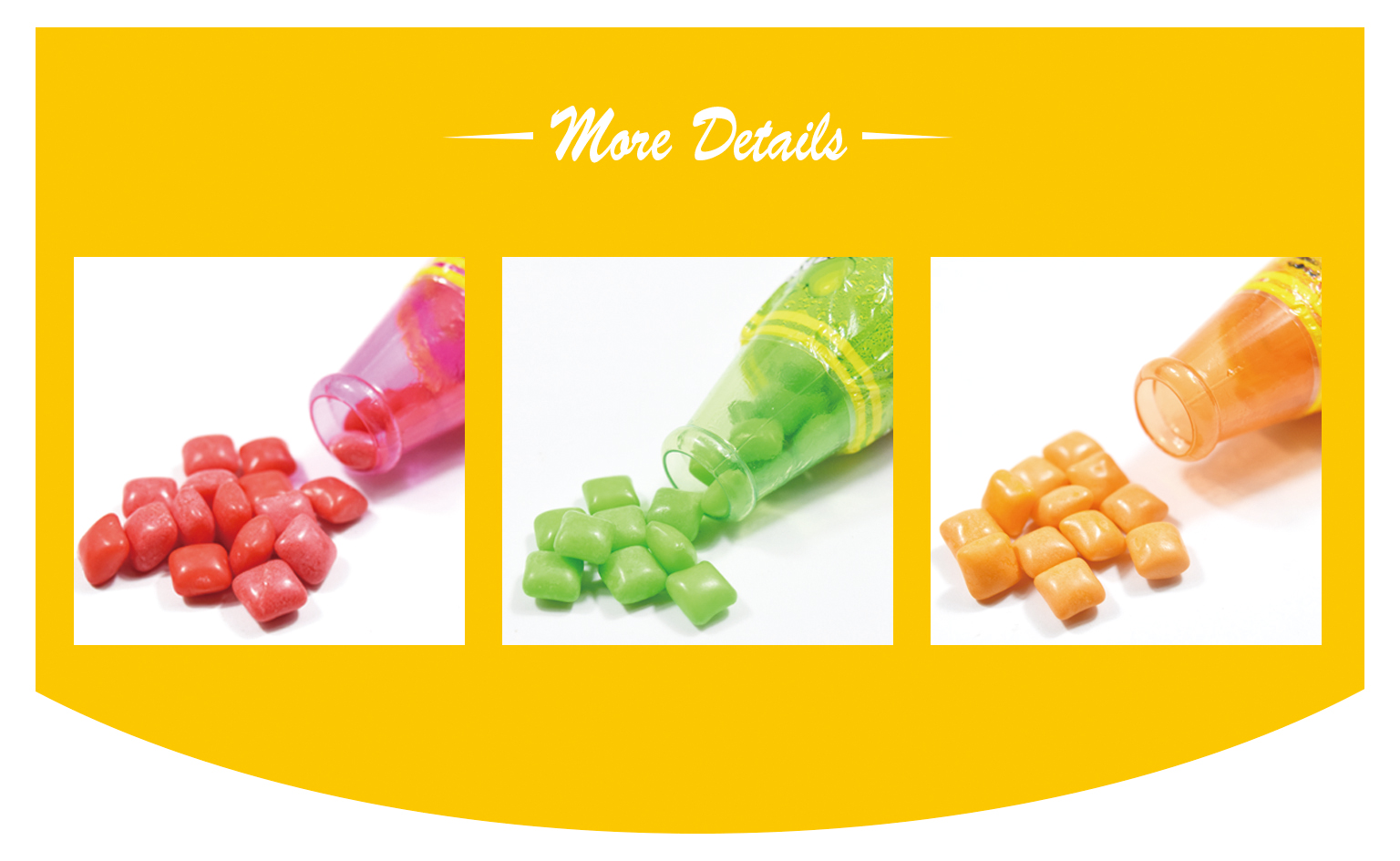 Gomme à bulles saveur fruitée en bouteille.un carton contient 24 boîtes, une boîte contient 30 pièces.
