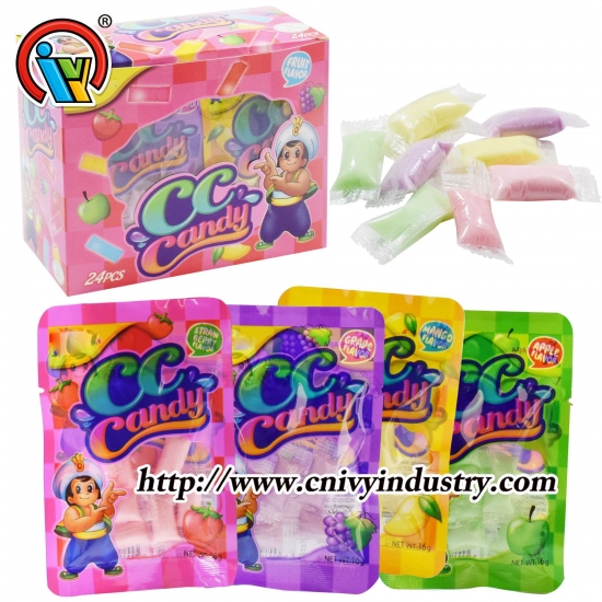 mini bâton cc saveur fruitée dans un sac.un carton contient 24 boîtes, une boîte contient 24 pièces.