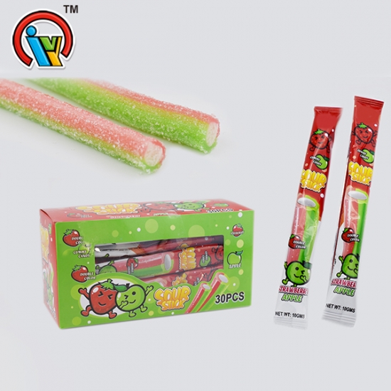 bonbon gélifié aigre à long bâton, un pcs 2 couleurs 2 saveurs, remplissage à l'intérieur de la poudre aigre, très bon goût, vente chaude en amérique du sud, marchés américains.peut faire un poids différent avec une taille de bâton long et une taille courte.
